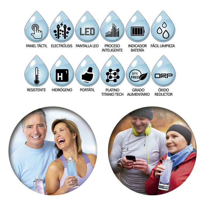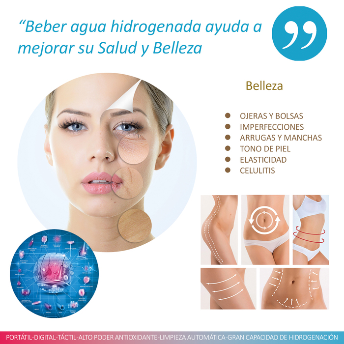 Creada y diseñada para hidrogenar el agua de la botella mediante un generador que trasforma el agua corriente en agua antioxidante rica en hidrogeno en pocos minutos.