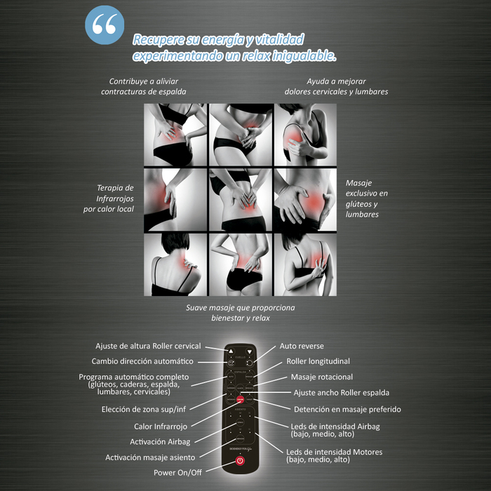 Además, El mando de control permite cambiar de programa, intensidad y área de masaje con un solo toque, manteniendo una experiencia segura, cómoda y silenciosa.