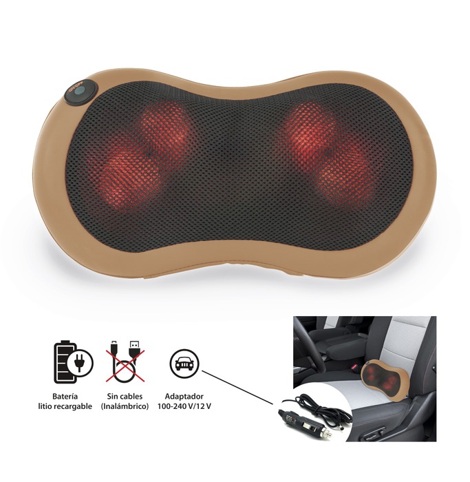 Totalmente inalámbrico, te libera de cables para usarlo en casa, en la oficina o incluso en el coche (incluye adaptador 12 V), manteniendo una postura cómoda durante el masaje.