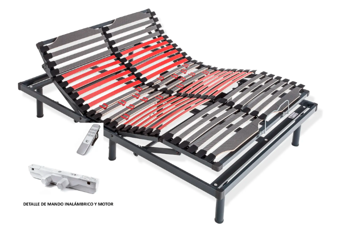 Diseñado para ofrecer confort y fiabilidad, este somier incorpora un motor inalámbrico de 24 V DC con actuador doble (2× 6.500 Nw) que eleva cabeza y pies de forma suave y silenciosa.